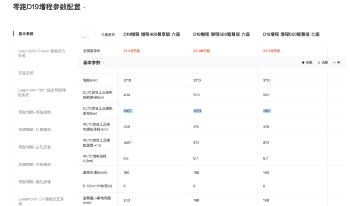 也可能是这样的原因,我看到零跑D19无论是入门还是顶配,很多指标都保持一致。即便最便宜的增程400尊享版,也有CDC悬架、激光雷达和高通8797芯片。